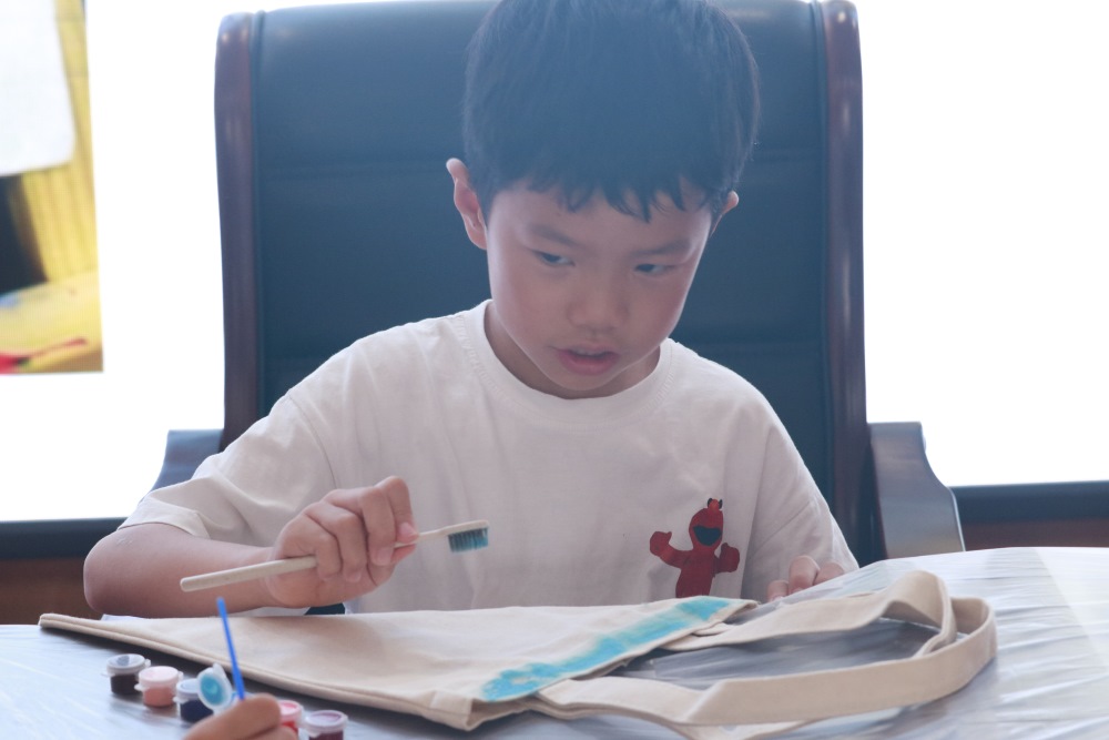 在心理健康課上,思思老師為同學們講解了愛自己的重要性與愛自己的方式,在無形和有形中鼓勵小朋友們都要接受并愛自己。在手工DIY課上,婷婷老師通過七色花的故事引導小朋友們說出自己的愿望,接著小朋友們將自己的想法用彩筆表達在帆布包上。一支支普通的彩筆,勾畫出小朋友們腦海中獨特有燦爛的童話世界。